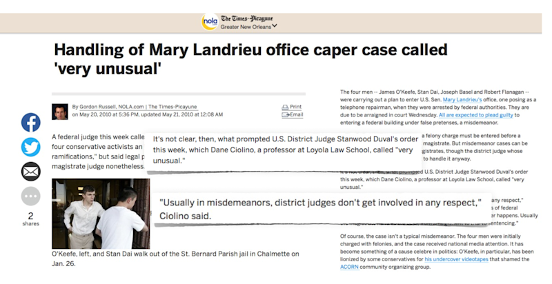 Lie #5: James O'Keefe is a felon, broke into the office of, bugged, wiretapped or attempted to wiretap phones of U.S. Sen. Mary Landrieu